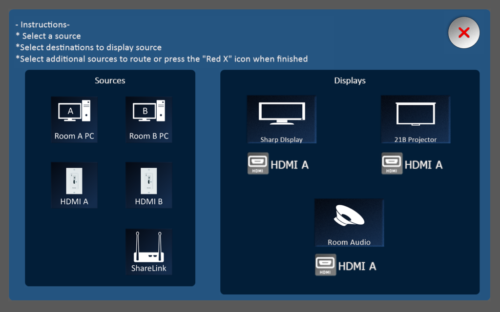 • Simple in-wall controller for choosing content, turning the all displays on/off and controlling audio and other sources